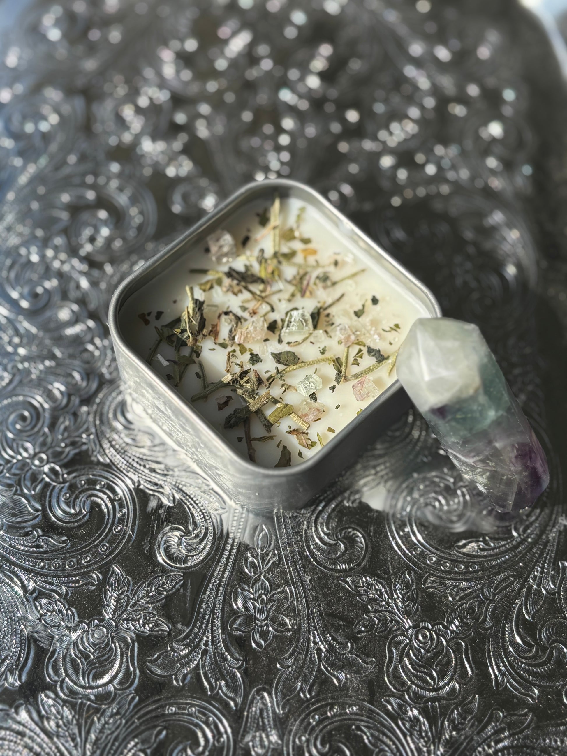 Sharpen your senses. Focus, Witch Intention Melts are crafted with an energizing blend of rosemary, peppermint, and a clarifying focus-boosting oil. Each 1.5 oz melt is crowned with crushed fluorite and nettle leaf for clarity, concentration, and mental stamina.